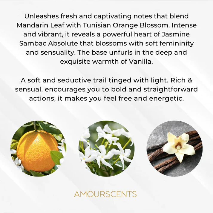 Fresh and captivating notes that blend Mandarin Leaf with Tunisian Orange Blossom. Intense and vibrant, it reveals a powerful heart of Jasmine Sambac Absolute that blossoms with soft femininity and sensuality. The base unfurls in the deep and exquisite warmth of Vanilla. A soft and seductive trail tinged with light. Rich & sensual. encourages you to bold and straightforward actions, it makes you feel free and energetic.
