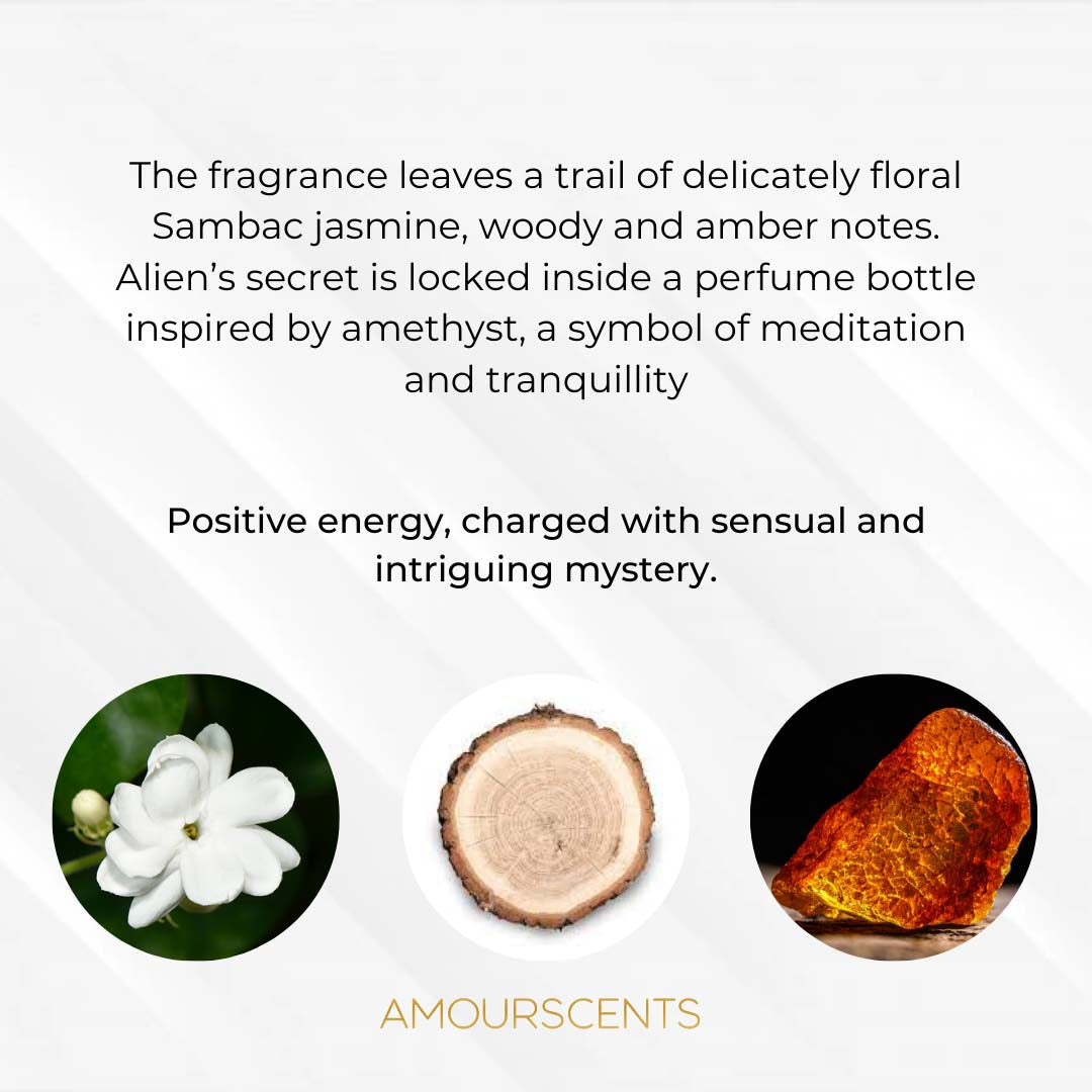 Alien Parfum is worn like an emblem and feels like an awakening borne of the sun, mystical and then enveloping. The Alien fragrance leaves a trail of delicately floral Sambac jasmine, woody and amber notes.