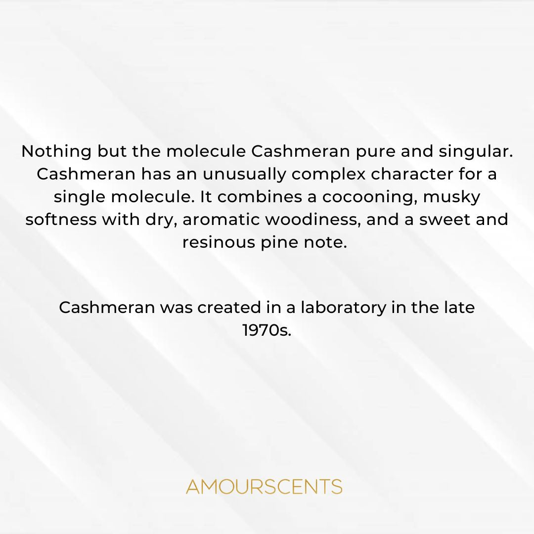 Nothing but the molecule Cashmeran pure and singular. Cashmeran has an unusually complex character for a single molecule. It combines a cocooning, musky softness with dry, aromatic woodiness, and a sweet and resinous pine note. Cashmeran was created in a laboratory in the late 1970s.