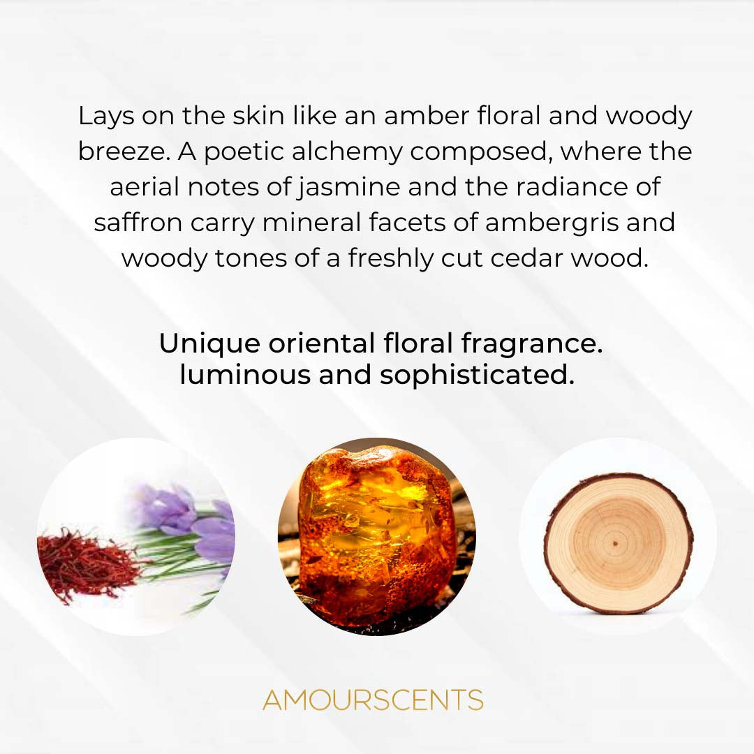 Amber floral and woody breeze. A poetic alchemy composed, where the aerial notes of jasmine and the radiance of saffron carry mineral facets of ambergris and woody tones of a freshly cut cedar wood. Oriental floral fragrance. Luminous and sophisticated.
