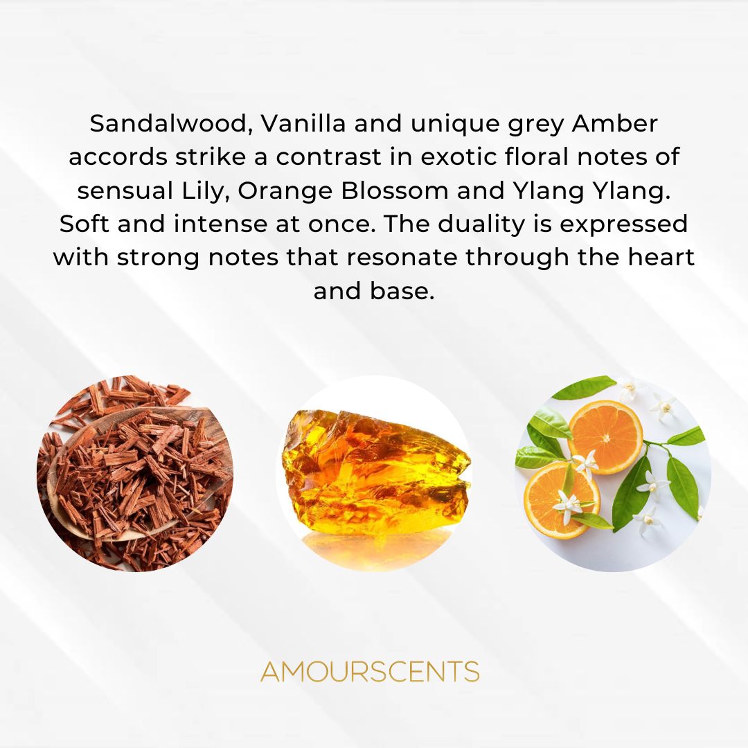 Sandalwood, Vanilla and unique grey Amber accords strike a contrast in exotic floral notes of sensual Lily, Orange Blossom and Ylang Ylang. Soft and intense at once. The duality is expressed with strong notes that resonate through the heart and base.
