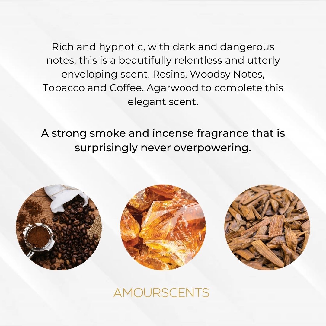 Rich and hypnotic, with dark and dangerous notes, this beautifully relentless and utterly enveloping scent. Resins, woodsy notes, tobacco and coffee. Agarwood to complete this elegant scent. A strong smoke and incense fragrance that is surprisingly never overpowering.