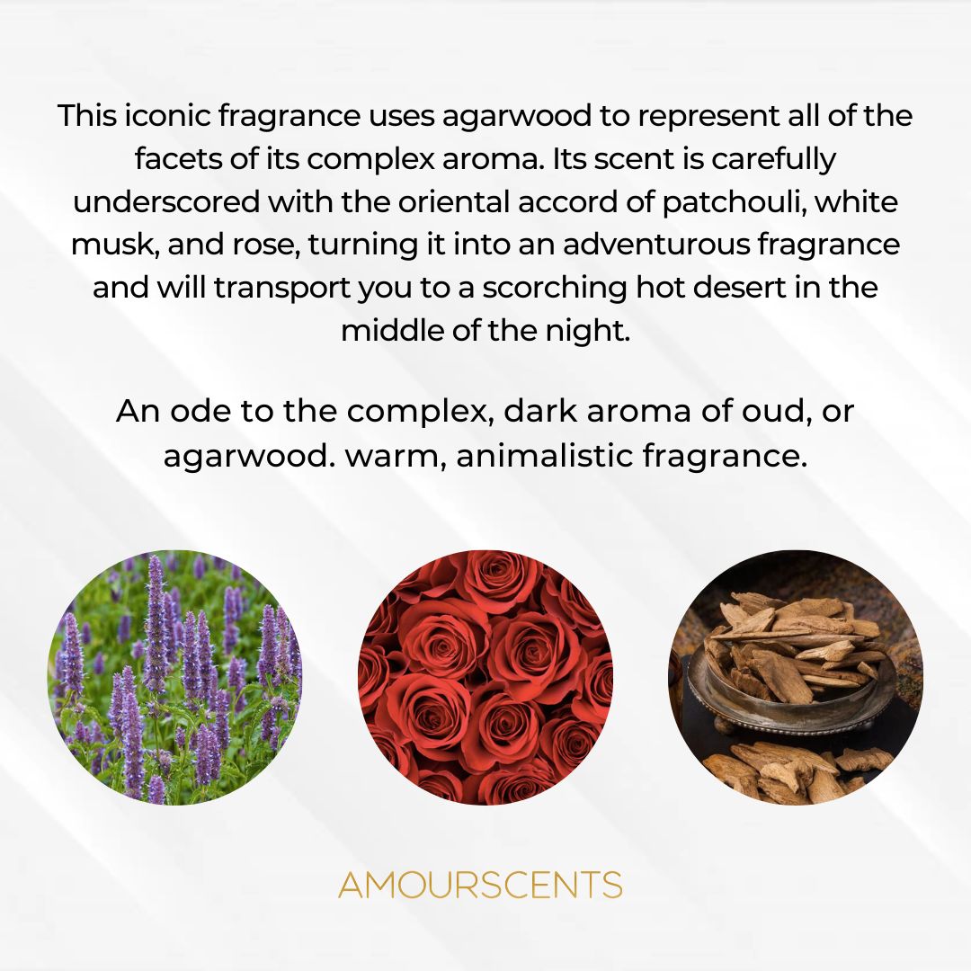 This iconic fragrance uses agarwood to represent all of the facets of its complex aroma. Its scent is carefully underscored with the oriental accord of patchouli, white musk, and rose, turning it into an adventurous fragrance and will transport you to a scorching hot desert in the middle of the night. An ode to the complex, dark aroma of oud, or agarwood. warm, animalistic fragrance.