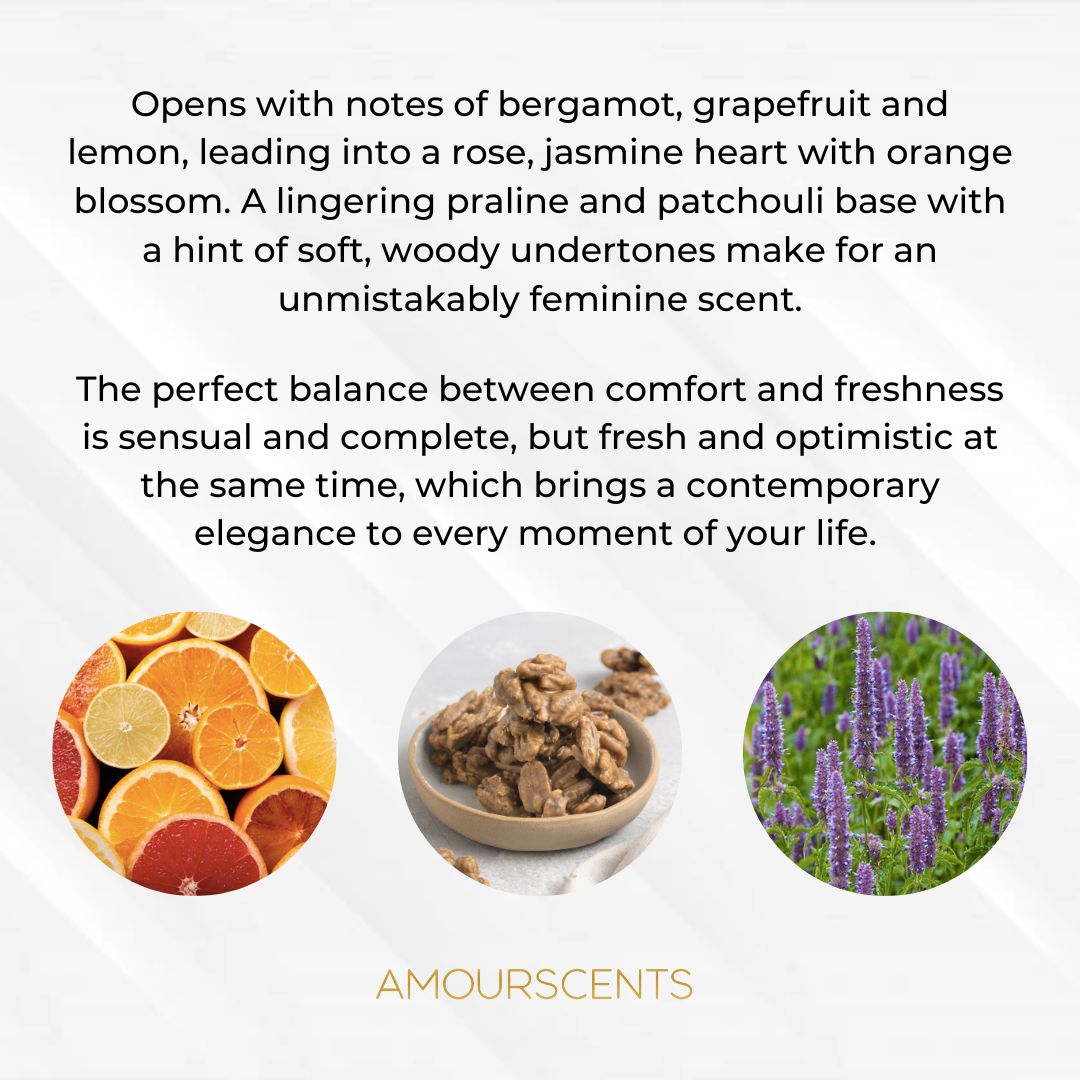 Opens with notes of bergamot, grapefruit and lemon, leading into a rose, jasmine heart with orange blossom. A lingering praline and patchouli base with a hint of soft, woody undertones make for an unmistakably feminine scent. The perfect balance between comfort and freshness is sensual and complete, but fresh and optimistic at the same time, which brings a contemporary elegance to every moment of your life.