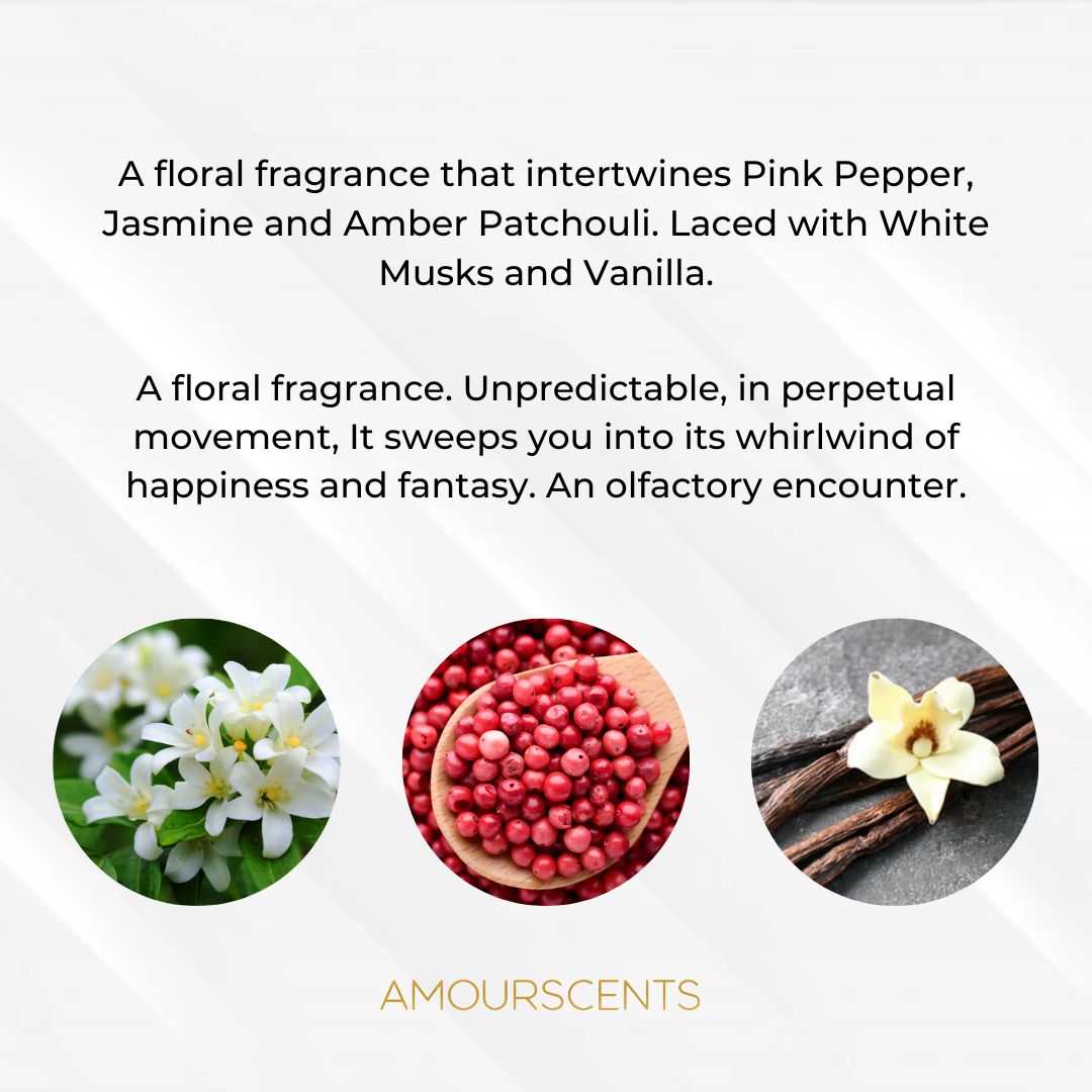 A floral fragrance that intertwines Pink Pepper, Jasmine and Amber Patchouli. Laced with White Musks and Vanilla. A floral fragrance that intertwines Pink Pepper, Jasmine and Amber Patchouli. Laced with White Musks and Vanilla.