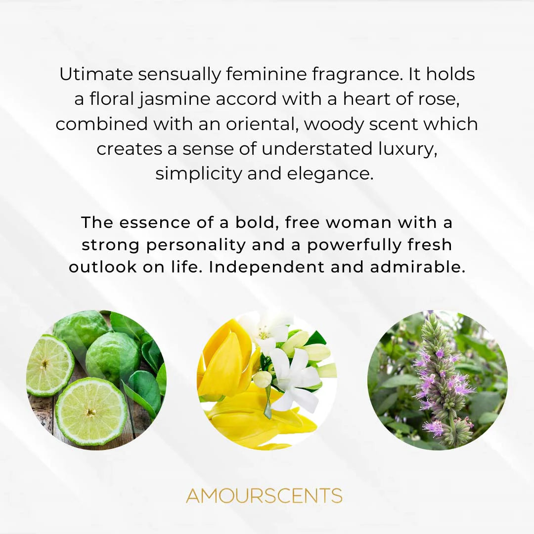 Ultimate sensually feminine fragrance. It holds a floral jasmine accord with a heart of rose, combined with an oriental, woody scent which creates a sense of understated luxury, simplicity and elegance. The essence of a bold, free woman with a strong personality and a powerfully fresh outlook on life. Independent and admirable, nothing speaks louder than a vibrant scent of citrus with pure accents of Patchouli.