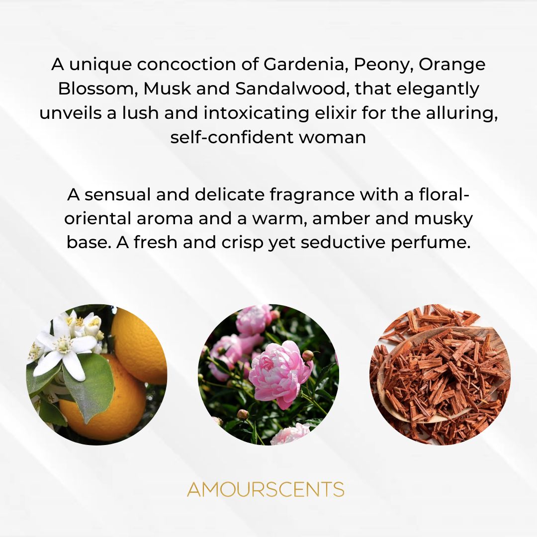 A unique concoction of Gardenia, Peony, Orange Blossom, Musk and Sandalwood, that elegantly unveils a lush and intoxicating elixir for the alluring, self-confident woman. A sensual and delicate fragrance with a floral-oriental aroma and a warm, amber and musky base. A fresh and crisp yet seductive perfume.