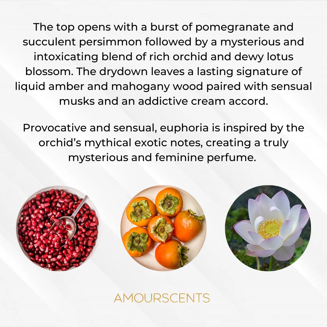 The top opens with a burst of pomegranate and succulent persimmon followed by a mysterious and intoxicating blend of rich orchid and dewy lotus blossom. The drydown leaves a lasting signature of liquid amber and mahogany wood paired with sensual musks and an addictive cream accord.