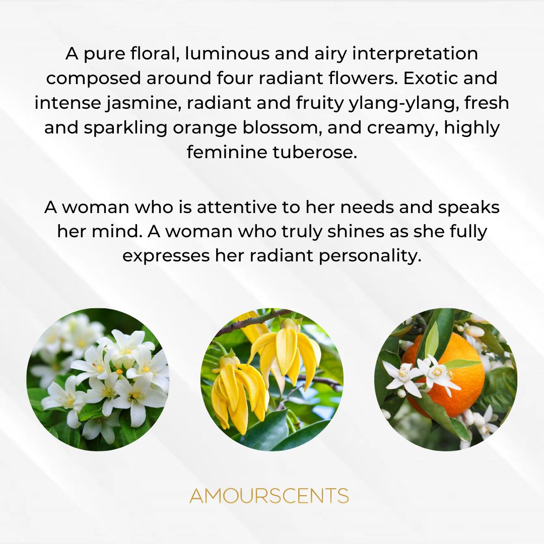 A pure floral, luminous and airy interpretation composed around four radiant flowers. Exotic and intense jasmine, radiant and fruity ylang-ylang, fresh and sparkling orange blossom, and creamy, highly feminine tuberose. A woman who is attentive to her needs and speaks her mind. A woman who truly shines as she fully expresses her radiant personality.