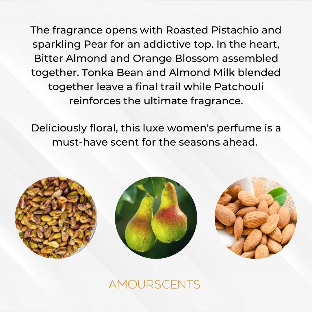 The fragrance opens with Roasted Pistachio and sparkling Pear for an addictive top. In the heart, Bitter Almond and Orange Blossom assembled together. Tonka Bean and Almond Milk blended together leave a final trail while Patchouli reinforces the ultimate fragrance. Deliciously floral, this luxe women's perfume is a must-have scent for the seasons ahead.