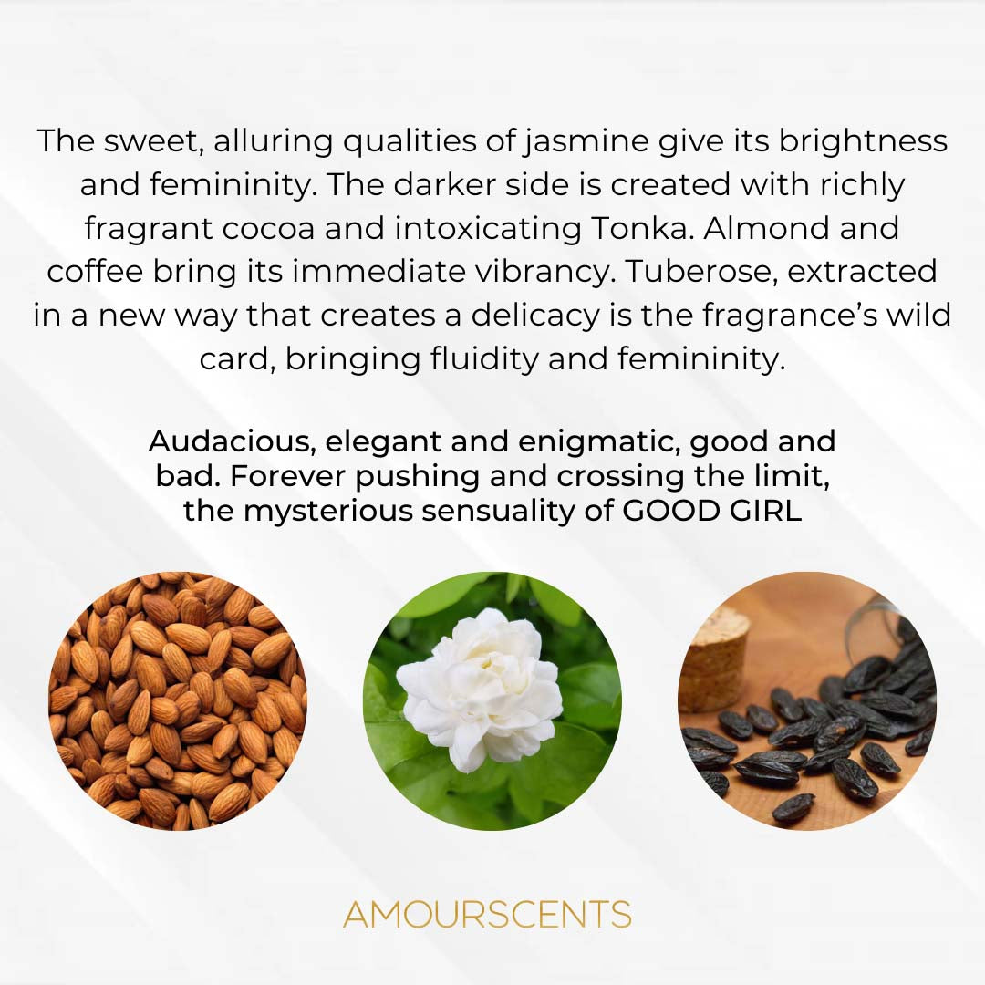 A unique vision of the duality of the modern woman: audacious, elegant and enigmatic, good and bad. Forever pushing and crossing the limit, the mysterious sensuality of GOOD GIRL makes for a modern yet sophisticated fragrance. The sweet, alluring qualities of jasmine give its brightness and femininity. The darker side is created with richly fragrant cocoa and intoxicating Tonka. Almond and coffee bring its immediate vibrancy. Tuberose, extracted in a new way that creates a delicacy is the fragrance’s wild card, bringing fluidity and femininity.