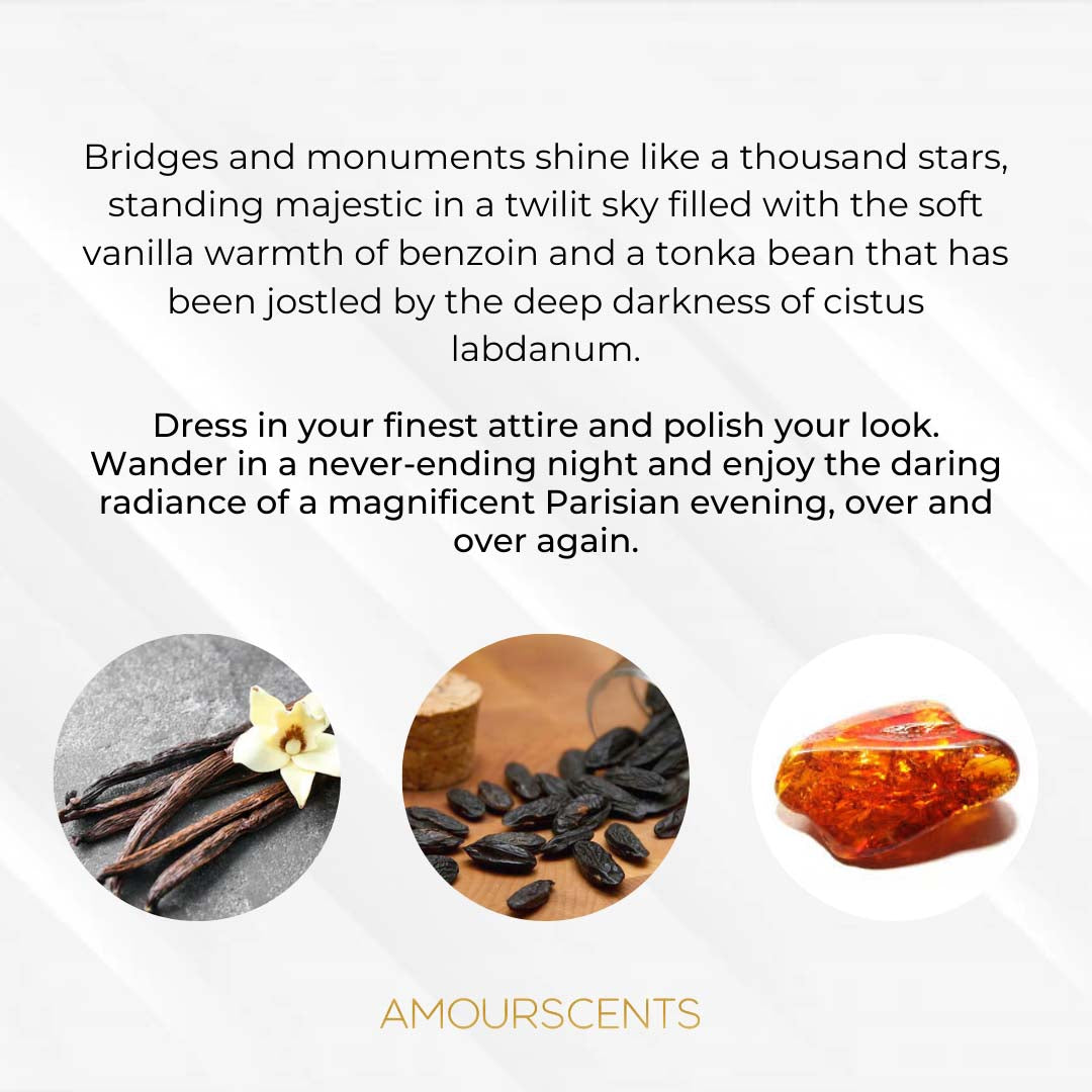 Dress in your finest attire and polish your look. Wander in a never-ending night and enjoy the daring radiance of a magnificent Parisian evening, over and over again. Bridges and monuments shine like a thousand stars, standing majestic in a twilit sky filled with the soft vanilla warmth of benzoin and a tonka bean that has been jostled by the deep darkness of cistus labdanum.