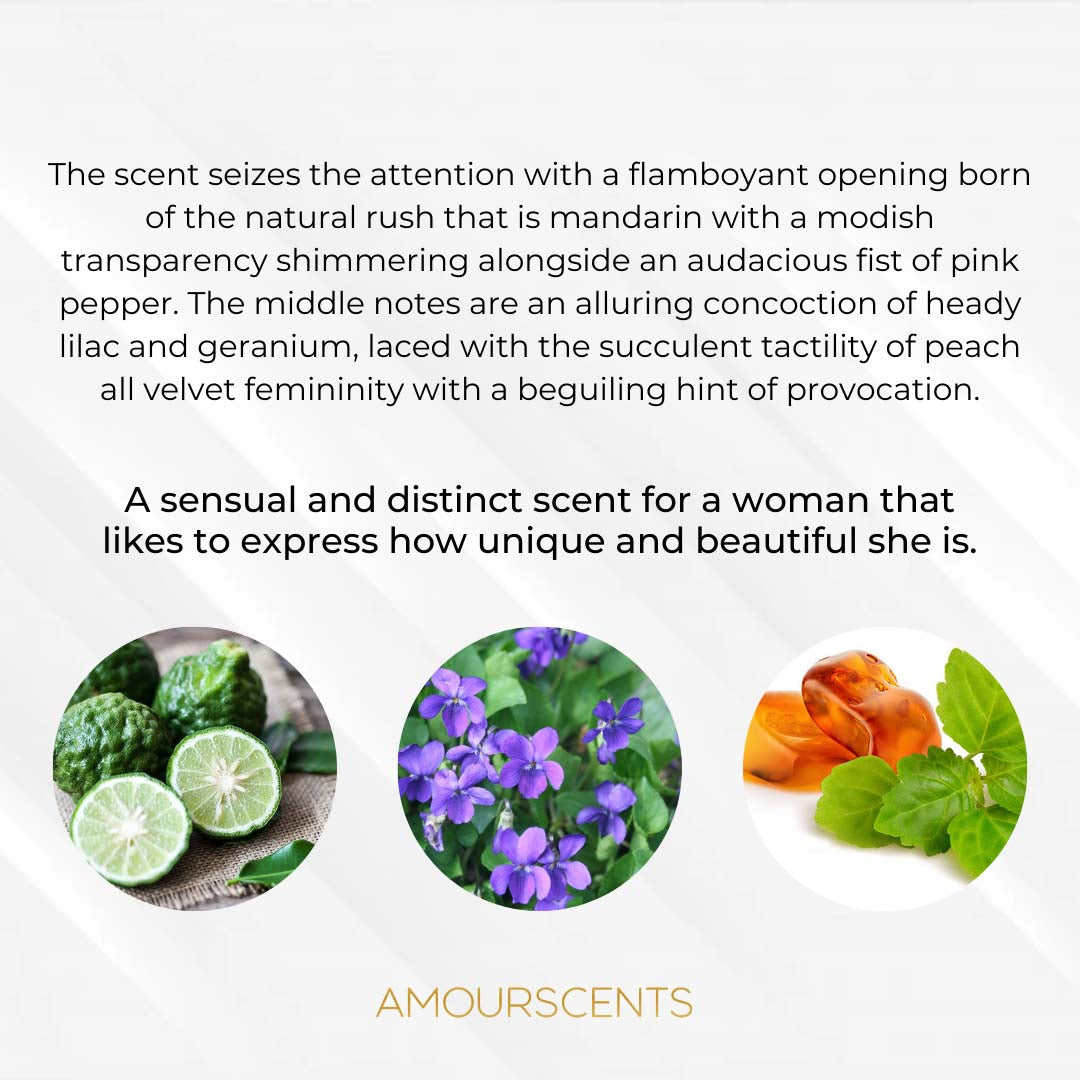 Entice by Amour Scents is a perfume that touches the sensual universality of this icon - that would intoxicate a man as much as a woman. Bright, confident and uplifting. This luminous and hypnotic combination of floral, gourmand and fruity accords, this comforting aroma emboldens the wearer in all manner of scenarios and is marvellous for special occasions. A sweet, fruity fragrance.