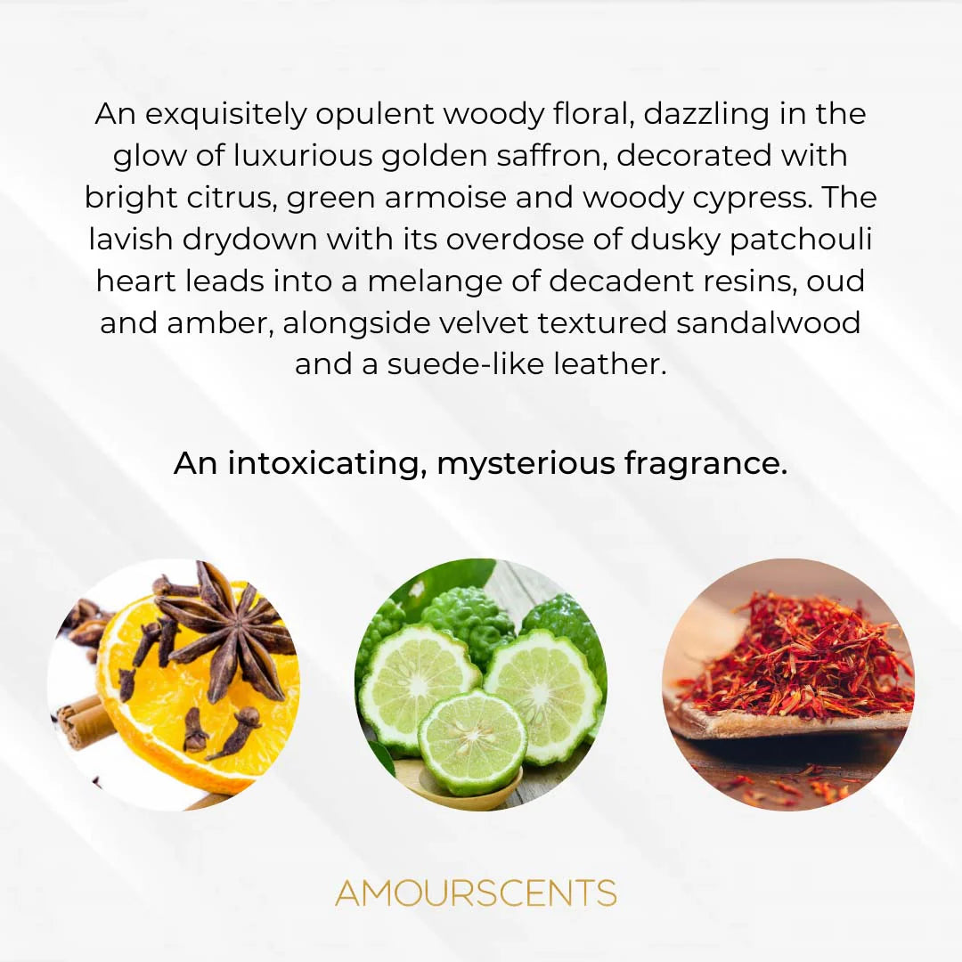 The fragrance is rich, soft, sweet, spicy, warm and sensual. This sumptuous scent builds a sweet and spicy accord around the central note of Aoud. The elegant tones of Rose are met with the fruity sweetness of Fig and the balsamic sweetness of Benzoin, as Cinnamon and Saffron lend their resonating warmth. Enveloping fragrance fans in a cloud of olfactive majesty, the cult status of Amber Aoud is not without justification