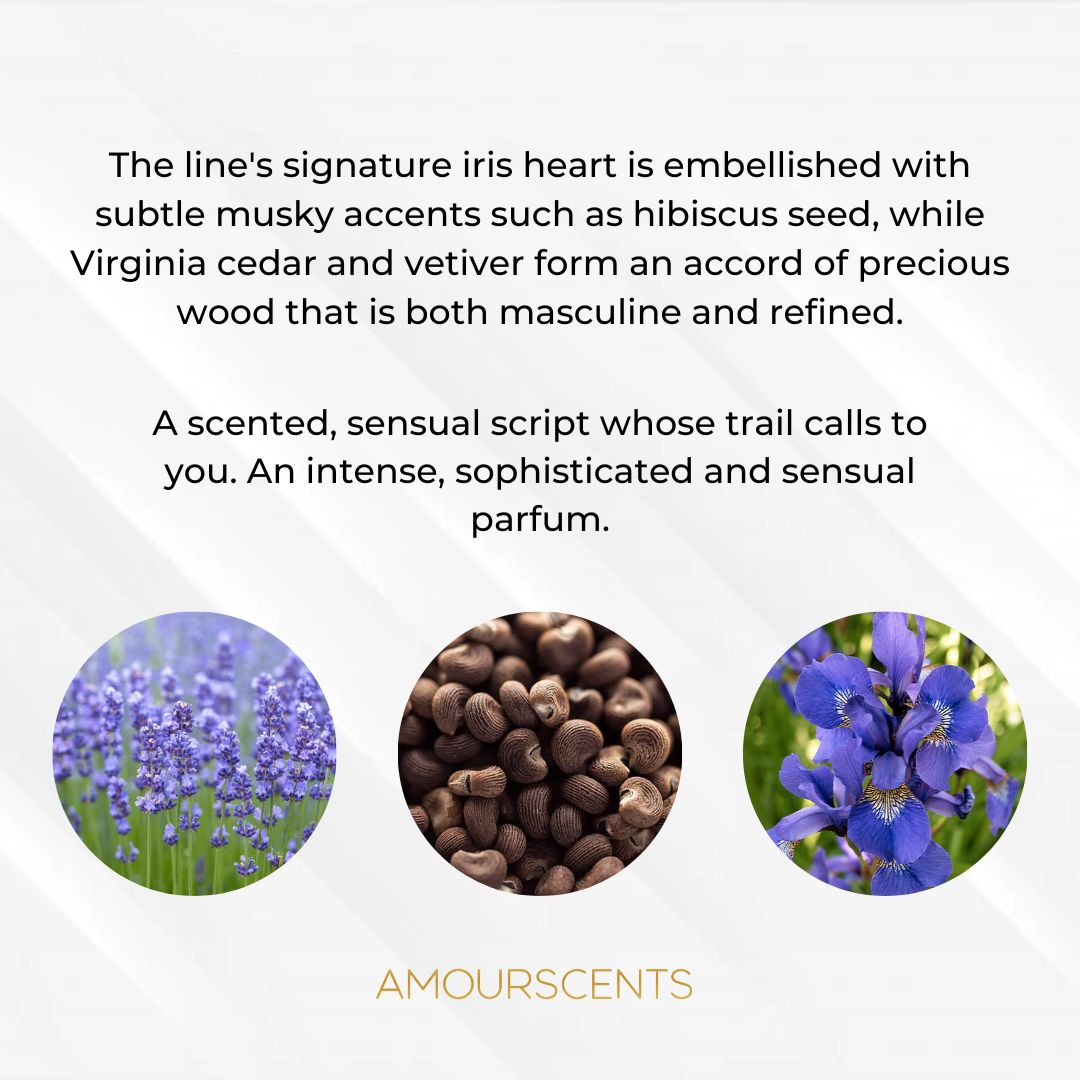 The line's signature iris heart is embellished with subtle musky accents such as hibiscus seed, while Virginia cedar and vetiver form an accord of precious wood that is both masculine and refined. A scented, sensual script whose trail calls to you. An intense, sophisticated and sensual parfum.