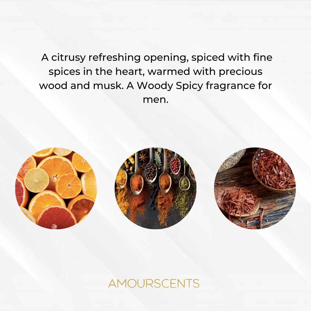 A citrusy refreshing opening, spiced with fine spices in the heart, warmed with precious wood and musk. A Woody Spicy fragrance for men.
