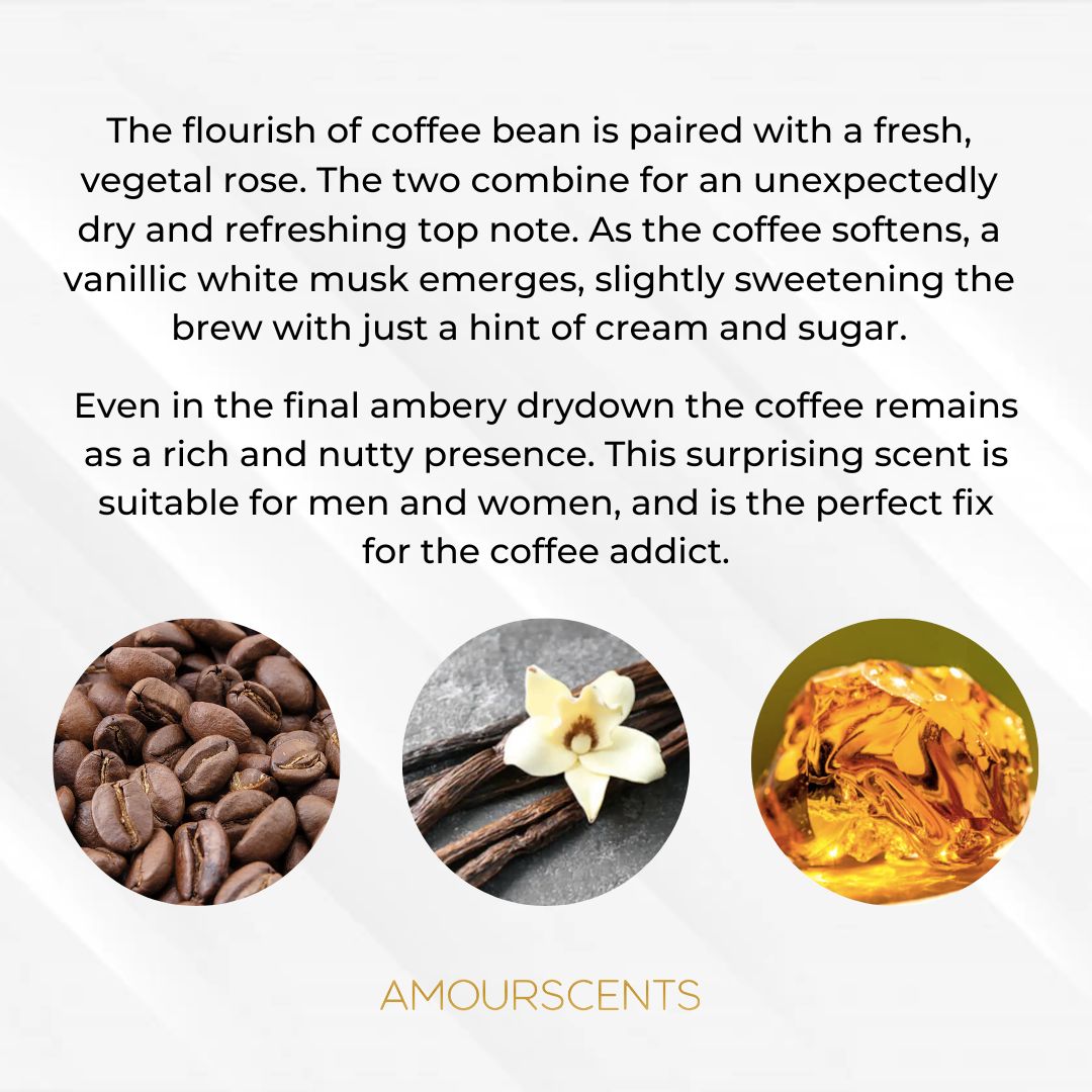 The flourish of coffee bean is paired with a fresh, vegetal rose. The two combine for an unexpectedly dry and refreshing top note. As the coffee softens, a vanillic white musk emerges, slightly sweetening the brew with just a hint of cream and sugar. Even in the final ambery drydown the coffee remains as a rich and nutty presence. This surprising scent is suitable for men and women, and is the perfect fix for the coffee addict.