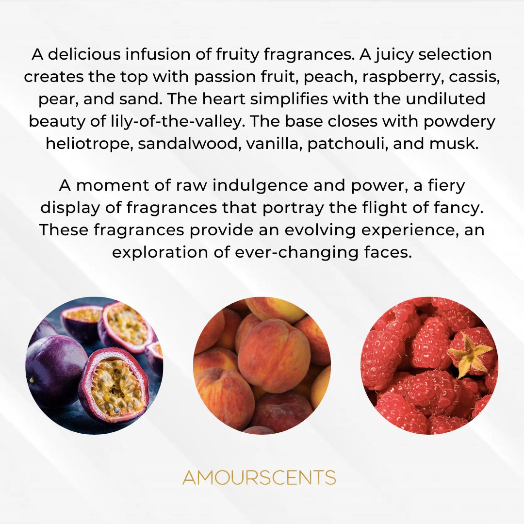 A delicious infusion of fruity fragrances. A juicy selection creates the top with passion fruit, peach, raspberry, cassis, pear, and sand. The heart simplifies with the undiluted beauty of lily-of-the-valley. The base closes with powdery heliotrope, sandalwood, vanilla, patchouli, and musk. A moment of raw indulgence and power, a fiery display of fragrances that portray the flight of fancy.