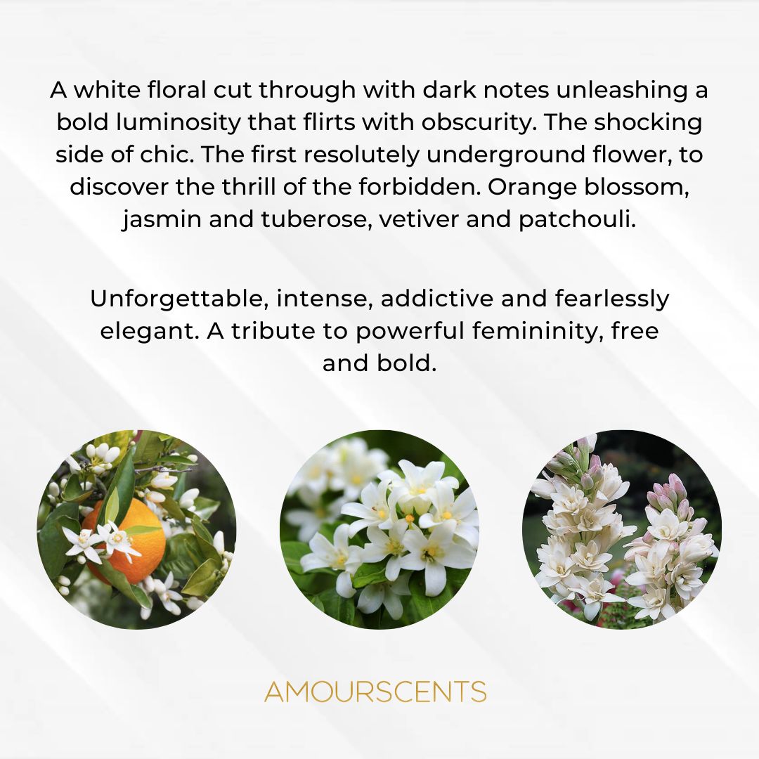 A white floral cut through with dark notes unleashing a bold luminosity that flirts with obscurity. The shocking side of chic. The first resolutely underground flower, to discover the thrill of the forbidden. Orange blossom, jasmin and tuberose, vetiver and patchouli. Unforgettable, intense, addictive and fearlessly elegant. A tribute to powerful femininity, free and bold.