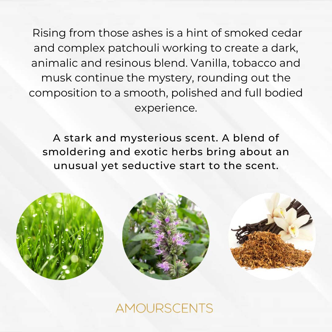 Rising from those ashes is a hint of smoked cedar and complex patchouli working to create a dark, animalic and resinous blend. Vanilla, tobacco and musk continue the mystery, rounding out the composition to a smooth, polished and full bodied experience. A stark and mysterious scent. A blend of smoldering and exotic herbs bring about an unusual yet seductive start to the scent.