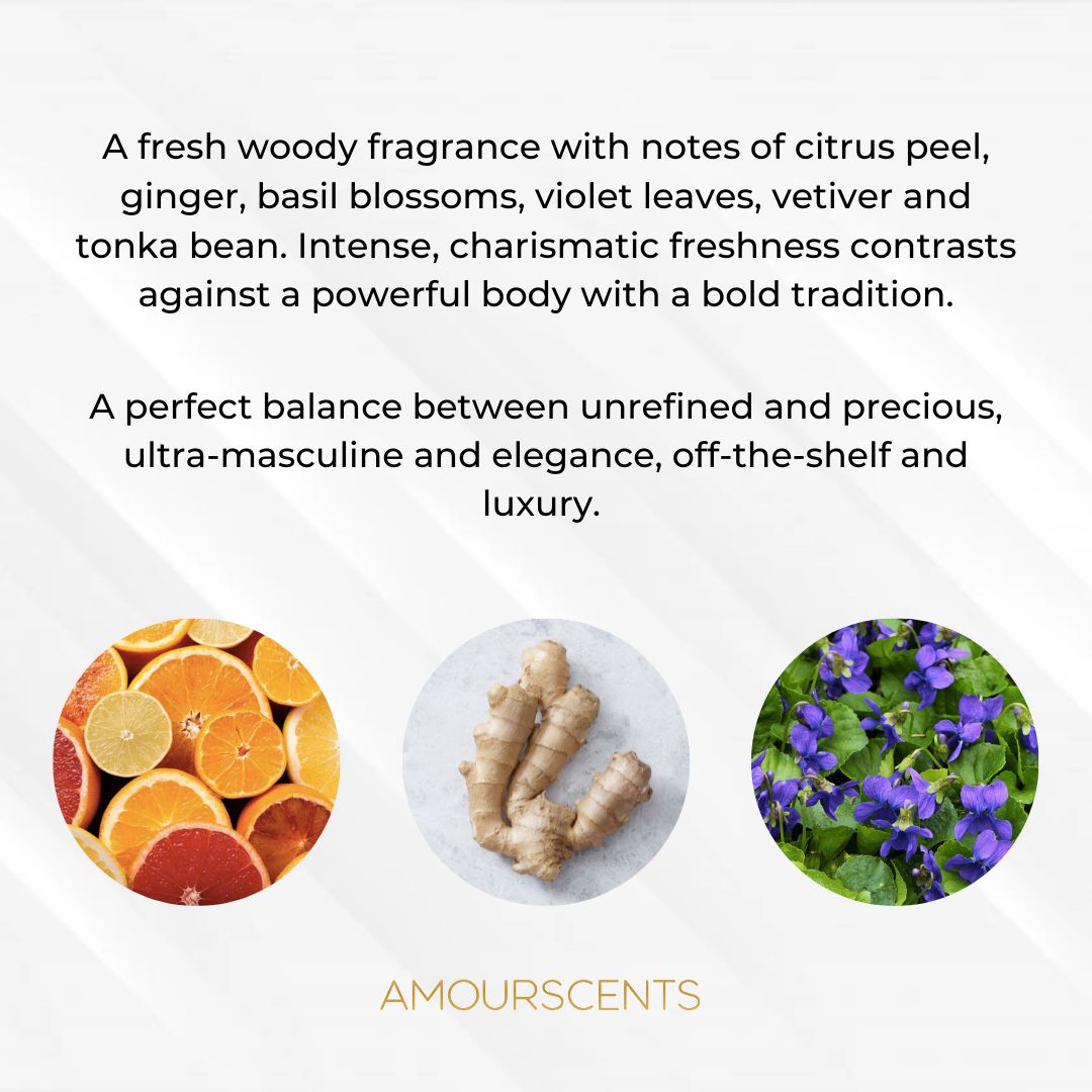 A fresh woody fragrance with notes of citrus peel, ginger, basil blossoms, violet leaves, vetiver and tonka bean. Intense, charismatic freshness contrasts against a powerful body with a bold tradition. A perfect balance between unrefined and precious, ultra-masculine and elegance, off-the-shelf and luxury.
