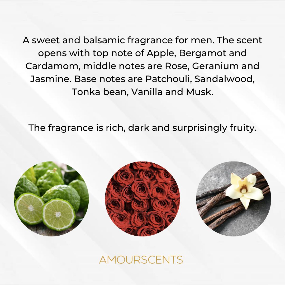 A sweet and balsamic fragrance for men. The scent opens with top note of Apple, Bergamot and Cardamom, middle notes are Rose, Geranium and Jasmine. Base notes are Patchouli, Sandalwood, Tonka bean, Vanilla and Musk. The fragrance is rich, dark and surprisingly fruity.