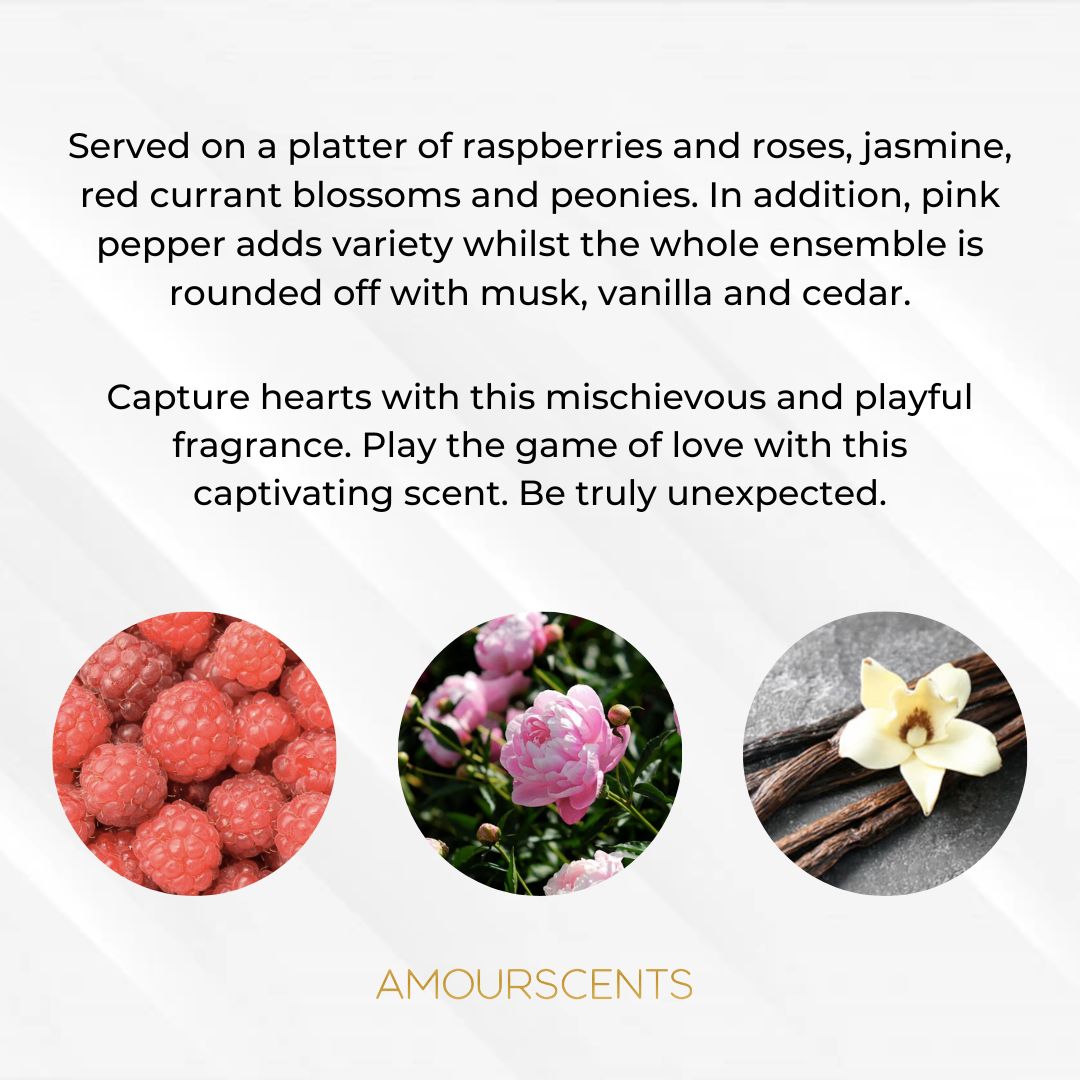 Served on a platter of raspberries and roses, jasmine, red currant blossoms and peonies. In addition, pink pepper adds variety whilst the whole ensemble is rounded off with musk, vanilla and cedar. Capture hearts with this mischievous and playful fragrance. Play the game of love with this captivating scent. Be truly unexpected.
