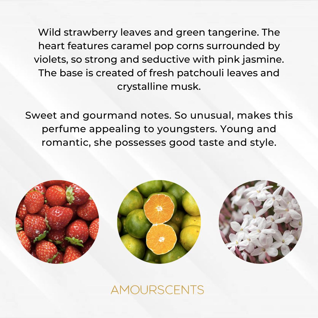 Wild strawberry leaves and green tangerine. The heart features caramel pop corns surrounded by violets, so strong and seductive with pink jasmine. The base is created of fresh patchouli leaves and crystalline musk. Sweet and gourmand notes. So unusual, makes this perfume appealing to youngsters. Young and romantic, she possesses good taste and style.
