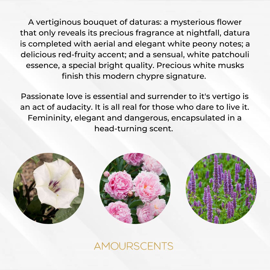 A mysterious flower that only reveals its precious fragrance at nightfall, datura is completed with aerial and elegant white peony notes; a delicious red-fruity accent; and a sensual, white patchouli essence, a special bright quality. Precious white musks finish this modern chypre signature. Passionate love is essential and surrender to its vertigo is an act of audacity. It is all real for those who dare to live it. Femininity, elegant and dangerous.