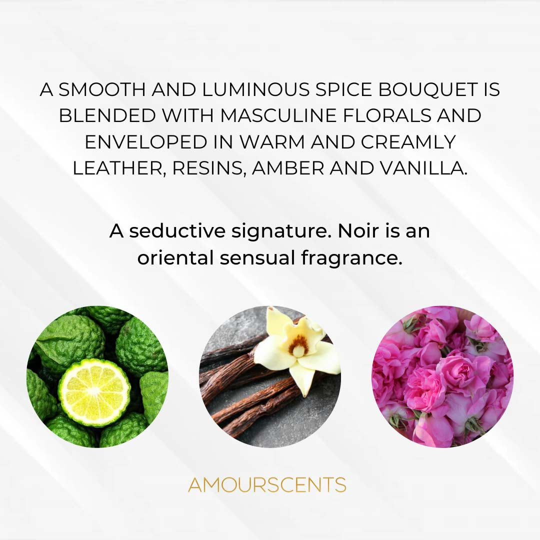 A seductive signature fragrance. Noir is an oriental sensual fragrance that captures the twin facets of the man; the refined, urbane sophisticate who the world gets to see and the intriguingly sensuous, private man that they don't. A smooth and luminous spice bouquet is blended with masculine florals and enveloped in warm and creamily leather, resins, amber and vanilla