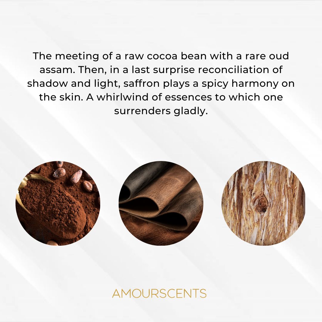 The meeting of a raw cocoa bean with a rare oud assam. Then, in a last surprise reconciliation of shadow and light, saffron plays a spicy harmony on the skin. A whirlwind of essences to which one surrenders gladly.