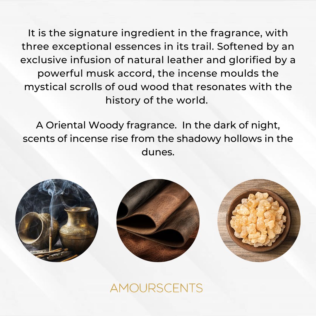 It is the signature ingredient in the fragrance, with three exceptional essences in its trail. Softened by an exclusive infusion of natural leather and glorified by a powerful musk accord, the incense moulds the mystical scrolls of oud wood that resonates with the history of the world. A Oriental Woody fragrance. In the dark of night, scents of incense rise from the shadowy hollows in the dunes.