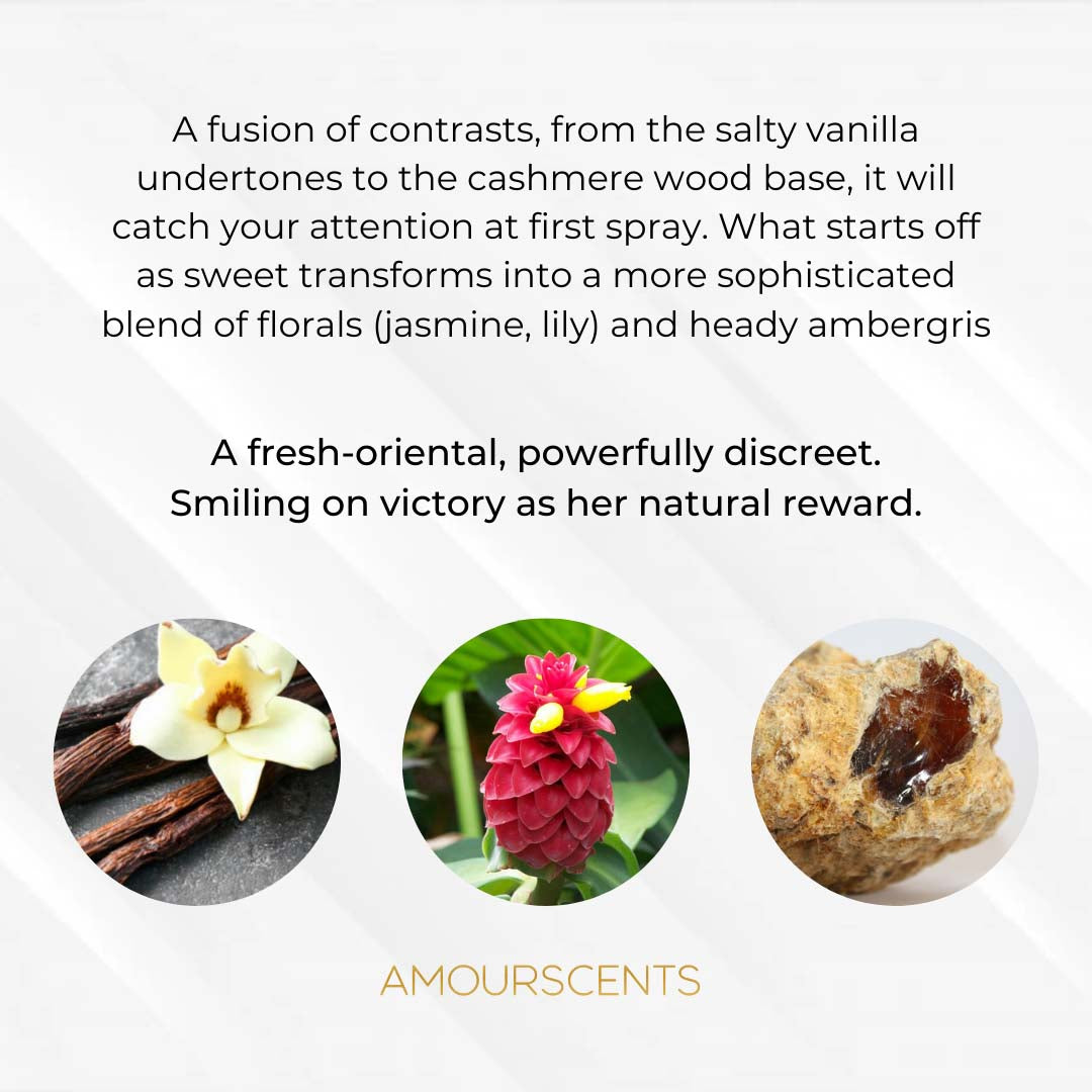 Composed of ambroxan, alongside other ingredients such as jasmine, moss and ambrette seeds absolute to give it spike and shine, A truly hypnotising and unique scent. A Amber Woody fragrance for women and men.