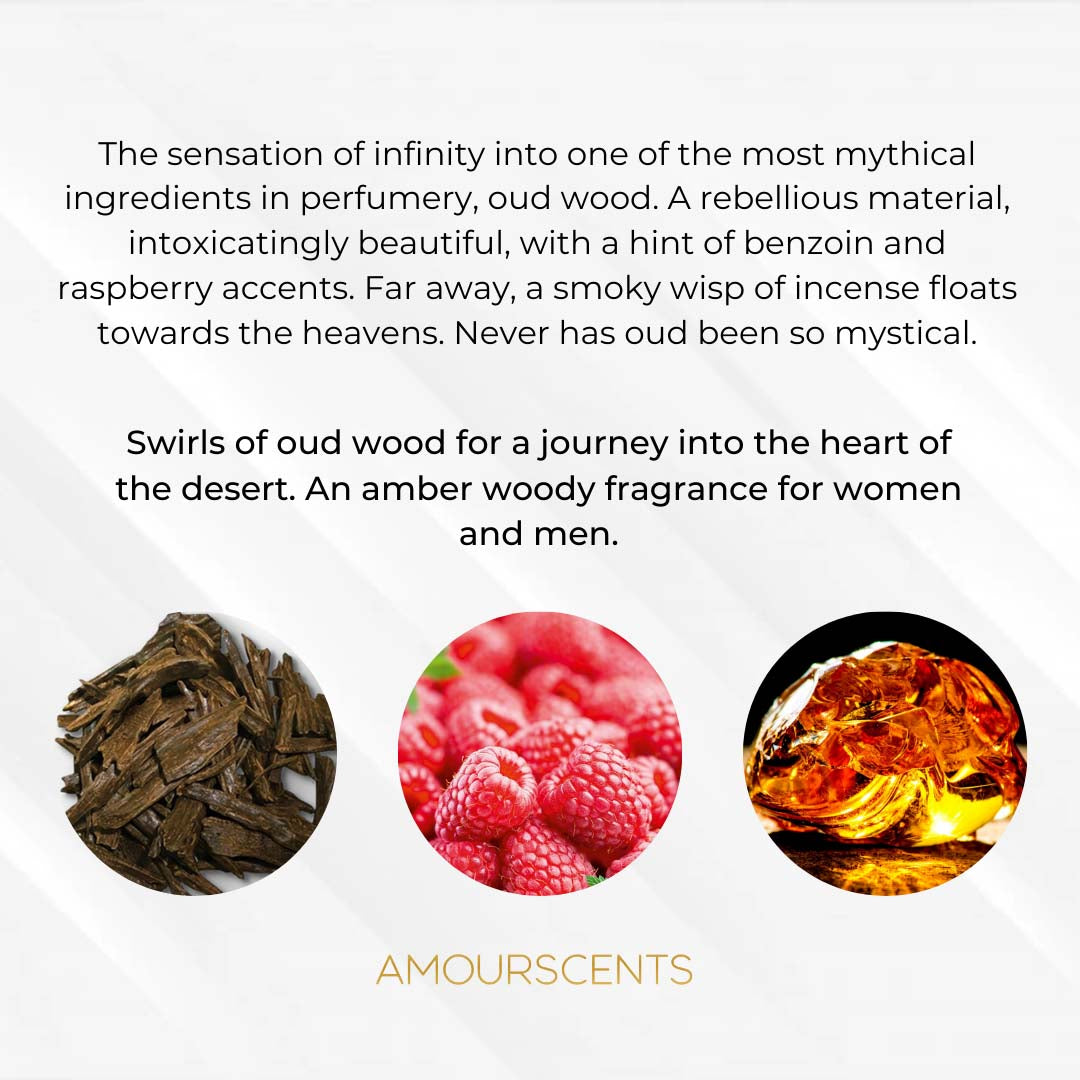 A hint of benzoin and raspberry accents. Far away, a smoky wisp of incense floats towards the heavens. Never has oud been so mystical. Swirls of oud wood for a journey into the heart of the desert. An amber woody fragrance for women and men.