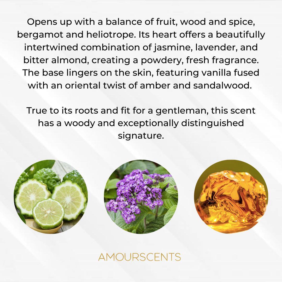 Opens up with a balance of fruit, wood and spice, bergamot and heliotrope. Its heart offers a beautifully intertwined combination of jasmine, lavender, and bitter almond, creating a powdery, fresh fragrance. The base lingers on the skin, featuring vanilla fused with an oriental twist of amber and sandalwood. True to its roots and fit for a gentleman, this scent has a woody and exceptionally distinguished signature.