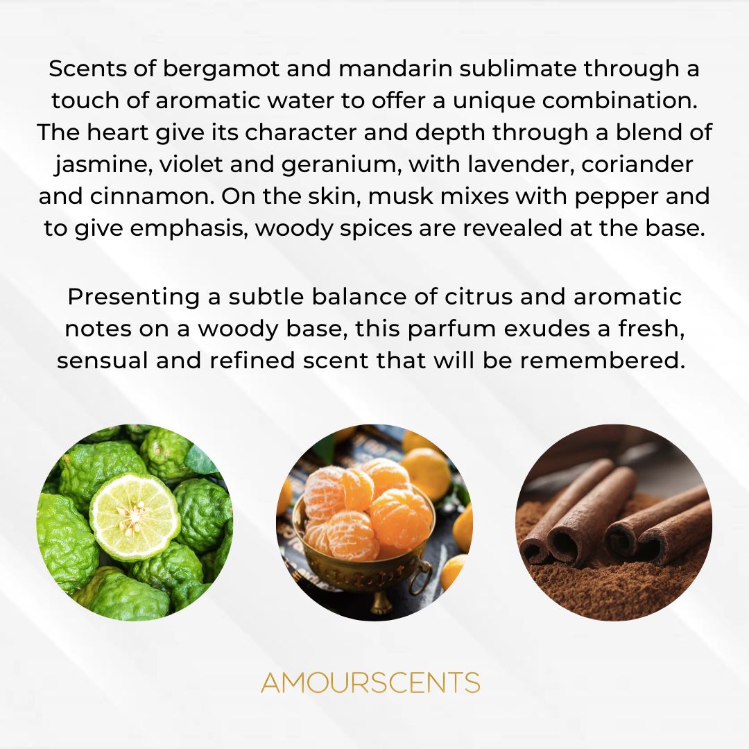 Bergamot and mandarin sublimate through a touch of aromatic water to offer a unique combination. The heart gives its character and depth through a blend of jasmine, violet and geranium, with lavender, coriander and cinnamon. On the skin, musk mixes with pepper and to give emphasis, woody spices are revealed at the base. Presenting a subtle balance of citrus and aromatic notes on a woody base