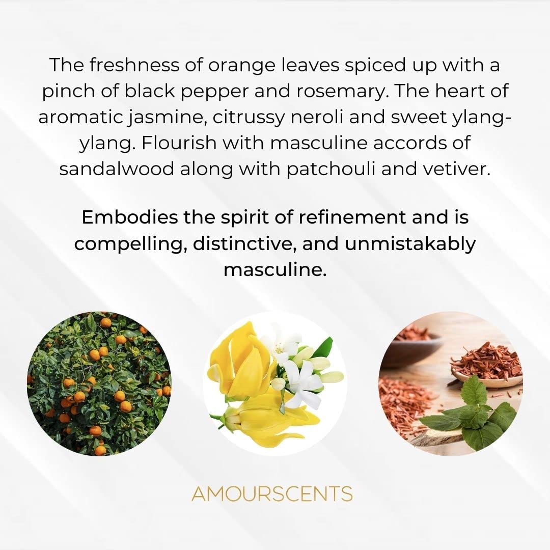 The freshness of orange leaves spiced up with a pinch of black pepper and rosemary. The heart of aromatic jasmine, citrussy neroli and sweet ylang-ylang. Flourish with masculine accords of sandalwood along with patchouli and vetiver. Embodies the spirit of refinement and is compelling, distinctive, and unmistakably masculine.
