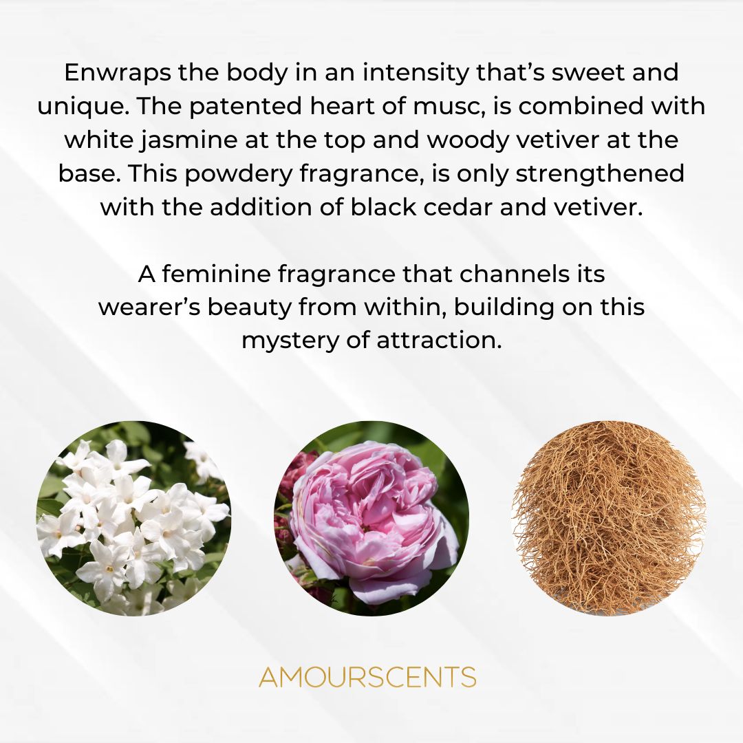 Enwraps the body in an intensity that’s sweet and unique. The patented heart of musc, is combined with white jasmine at the top and woody vetiver at the base. This powdery fragrance is only strengthened with the addition of black cedar and vetiver. A feminine fragrance that channels its wearer’s beauty from within, building on this mystery of attraction.