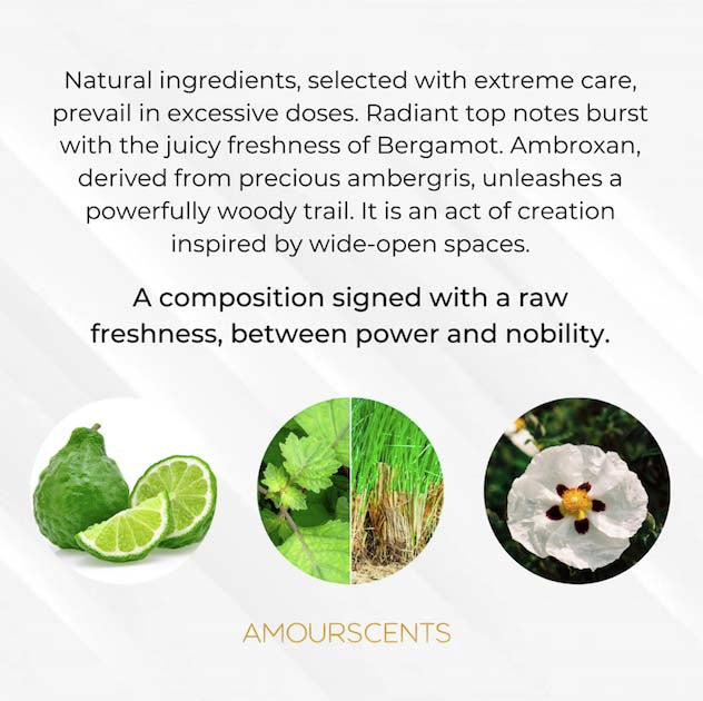 Selected with extreme care, prevail in excessive doses. Radiant top notes burst with the juicy freshness of Reggio di Calabria Bergamot. Ambroxan, derived from precious ambergris, unleashes a powerfully woody trail. It is an act of creation inspired by wide-open spaces. A composition signed with raw freshness, between power and nobility.