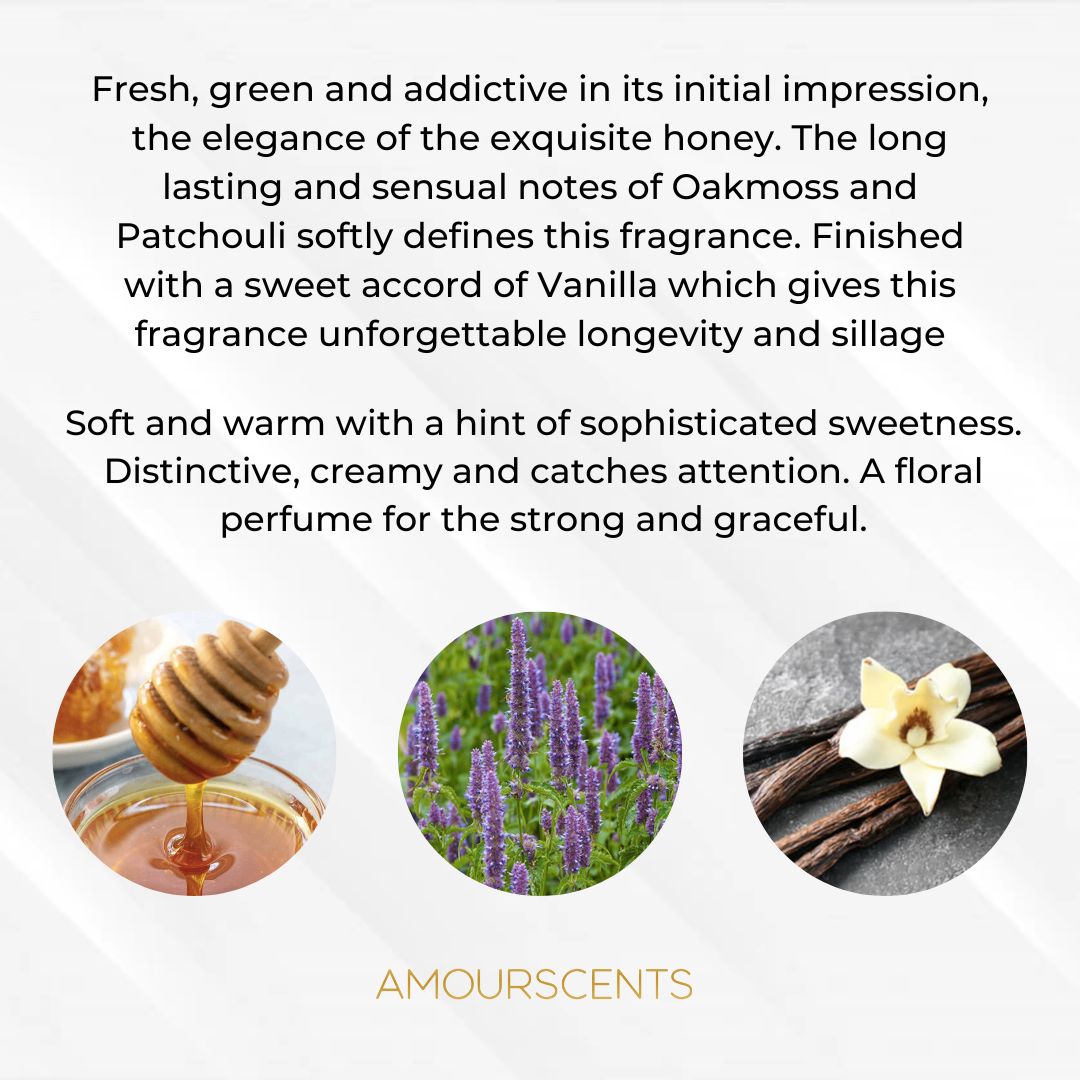 Fresh, green and addictive in its initial impression, the elegance of the exquisite honey. The long lasting and sensual notes of Oakmoss and Patchouli softly defines this fragrance. Finished with a sweet accord of Vanilla which gives this fragrance unforgettable longevity and sillage. Soft and warm with a hint of sophisticated sweetness. Distinctive, creamy and catches attention. A floral perfume for the strong and graceful.