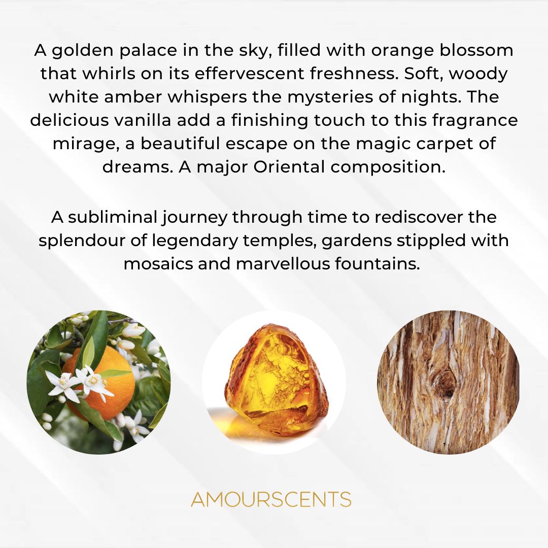 A golden palace in the sky, filled with orange blossom that whirls on its effervescent freshness. Soft, woody white amber whispers the mysteries of nights. The delicious vanilla add a finishing touch to this fragrance mirage, a beautiful escape on the magic carpet of dreams. A major Oriental composition. A subliminal journey through time to rediscover the splendour of legendary temples, gardens stippled with mosaics and marvellous fountains.