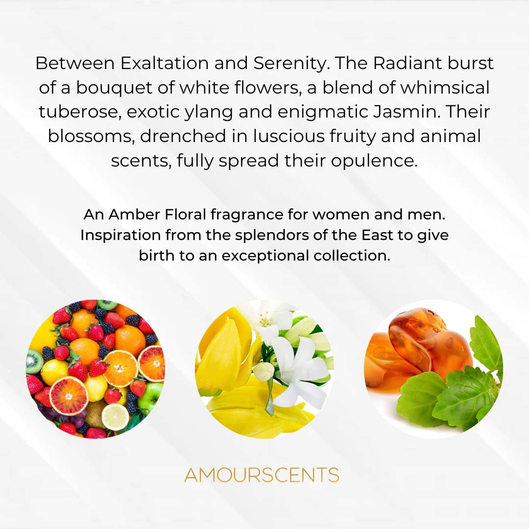 Between Exaltation and Serenity. The Radiant burst of a bouquet of white flowers, a blend of whimsical tuberose, exotic ylang and enigmatic Jasmin. Their blossoms, drenched in luscious fruity and animal scents, fully spread their opulence. An amber floral fragrance for women and men. Inspiration from the splendors of the east to give birth to an exceptional collection.