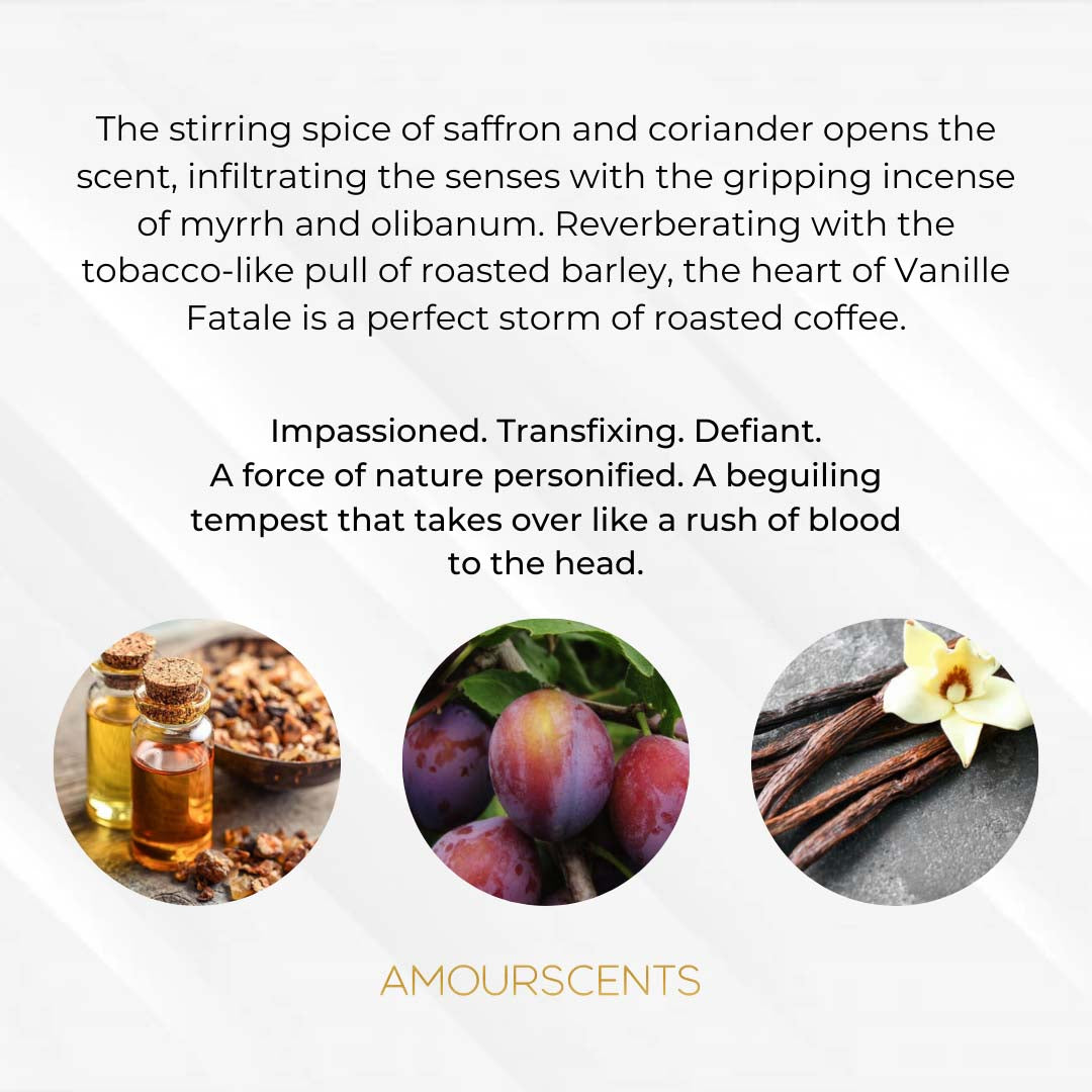 The stirring spice of saffron and coriander opens the scent, infiltrating the senses with the gripping incense of myrrh and olibanum. Reverberating with the tobacco-like pull of roasted barley, the heart of Vanille Fatale is a perfect storm of roasted coffee absolute, narcissus and frangipani that seduces with grounded floralcy. Vanilla blends with rich mahogany, its smoky glamour made all the more exotic with primal suede at the finish.