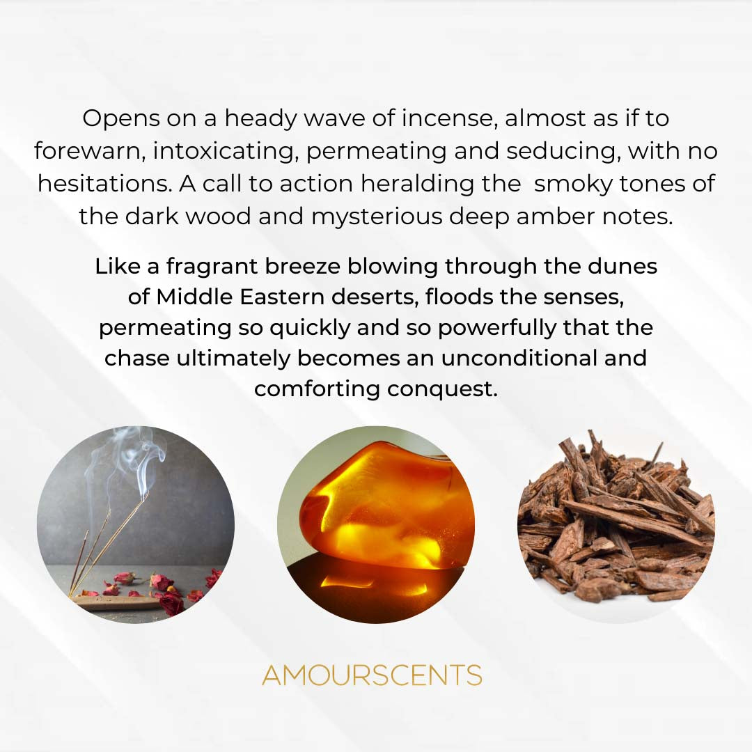 The fragrance opens on a heady wave of incense, almost as if to forewarn: incense is the quintessential perfume of Mediterranean and Middle Eastern lands, intoxicating, permeating and seducing, with no hesitations. A call to action heralding the rich smoky tones of the dark wood and mysterious deep ambery notes that follow. Perception dissolves in the final celebration of the soft musky notes, leaving the hot, heady aroma of a successful conquest lingering on the skin.