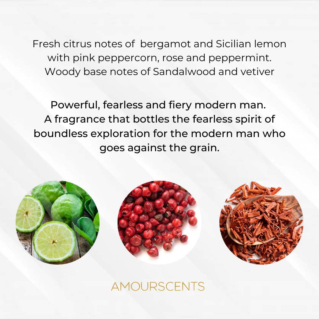 Fresh citrus notes of bergamot and Sicilian lemon with pink peppercorn, rose and peppermint. Woody base notes of sandalwood and vetiver. Powerful, fearless and fiery modern man. A fragrance that bottles the fearless spirit of boundless exploration for the modern man who goes against the grain.