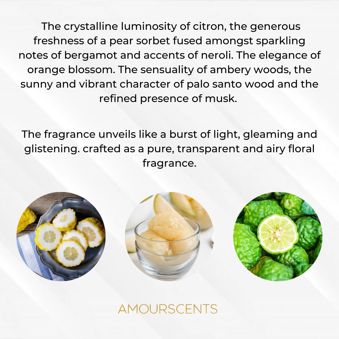 The crystalline luminosity of citron, the generous freshness of a pear sorbet fused amongst sparkling notes of bergamot and accents of neroli. The elegance of orange blossom. The sensuality of ambery woods, the sunny and vibrant character of palo santo wood and the refined presence of musk. The fragrance unveils like a burst of light, gleaming and glistening. crafted as a pure, transparent and airy floral fragrance.